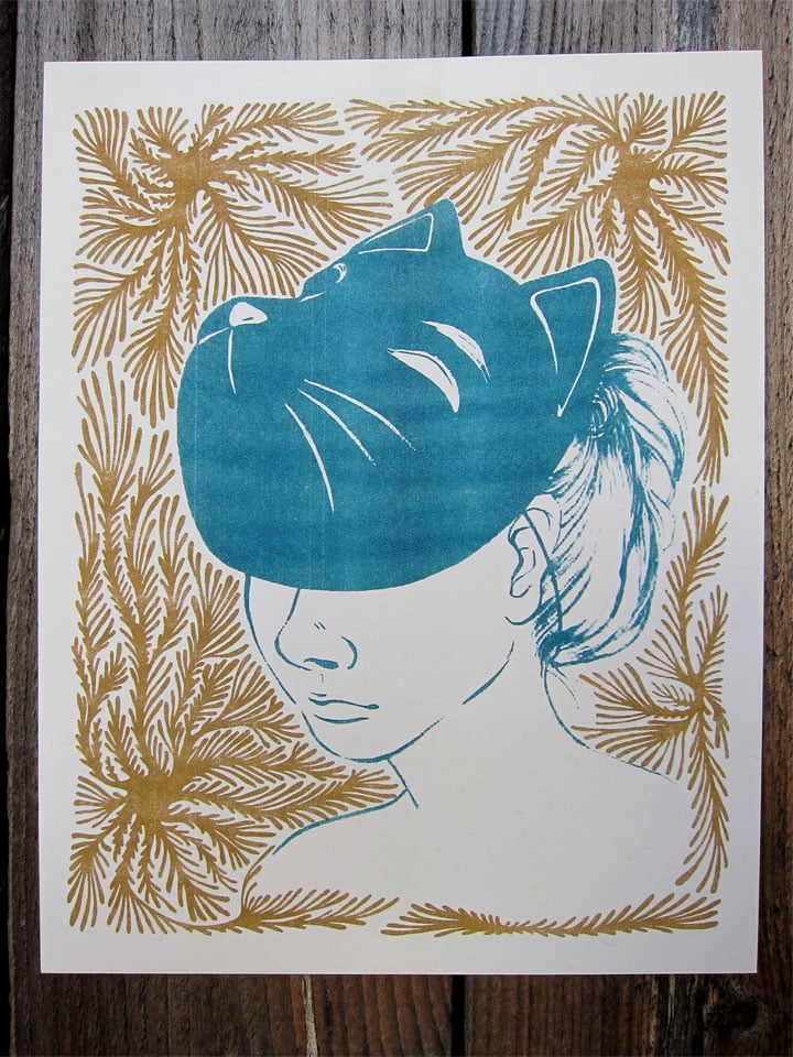 8" x 10" two color risograph print on cream colored French brand paper. The uneven texture of the ink is the nature of the risograph printing process and should be taken into consideration before purchase. This particular print is sold as one half of a pair, the two being sold together also in this shop.